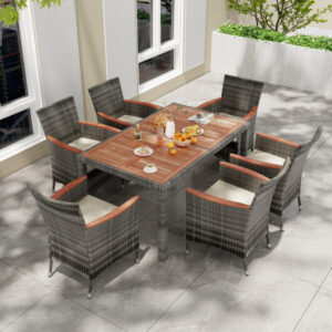 7 Pieces Patio Acacia Wood Cushioned PE Rattan Wicker Dining Set – Color: Brown