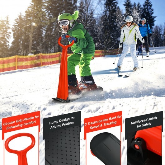 The premium-designed snow scooter (weight capacity: 170lbs) is the perfect winter toy for kids and teenagers whose age is over 5 years old and adult supervision is recommended. there exists a circular grip handle featuring an ergonomic design that enables a comfortable grip and helps maintain balance. plus the snow sled features a molded directional bottom and a slick grooved bottom for speeding up and tracking your route. the raised spots help increase foot friction and avoid slipping or wobbling while enjoying the thrill of downhill spinning. in addition made of heavy-duty cold-resistant high-impact and durable PP materials the snowboard can resist bad weather and provide lasting durability. and the 1-rider snow scooter can not only use in the sloped hill for the great thrill but also allow for flat ground that children can be easily hauled by parents with a rope. (rope not included rope hole included)