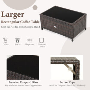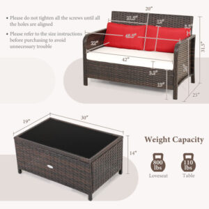 Specifications: Color of PE Rattan Mix Brown Color of Seat Cushion Off White Color of Back Cushion Red Material PE Rattan Metal Polyester Sponge Tempered Glass Dimension of Loveseat 45.5″ x 25″ x 31.5″ Dimension of Coffee Table 30″ x 19″ x 14″ Seat Height from the Ground 13″ Dimension of Seat Cushion 42″ x 22″ x 3.2″ Dimension of Back Cushion 21.5″ x 12″ x 5.5″ Net Weight of Loveseat 26 lbs Net Weight of Coffee Table 18 lbs Total Net Weight 44 lbs Weight Capacity of Loveseat 800 lbs Weight Capacity of Coffee Table 110 lbs