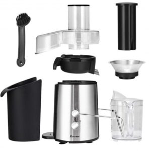 Specifications: Overall dimensions: 15″ x 8″ x 15.5″ (L x W x H) Material: PP + ABS + Stainless steel Color: Black + Sliver Rated voltage: 120 V Rated power: 700 W Rated frequency: 60 Hz Net weight: 8.7 lbs plup collector volume: 68 fl oz Juice jug volume: 34 fl oz Package included: 1 x Juice extractor 1 x Cleaning brush 1 x Plup collector 1 x Juice Jug 1 x Manual
