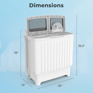 Specifications: Color Gray + White Material PP Overall Dimensions 25″ x 14″ x 29″ Open Lid Height 35.5″ Drain Hose Length 3 ft Inlet Hose Length 3.8 ft Rated Wash Capacity 12 lbs Rated Spin-dry Capacity 8 lbs Rated Input Power Washing Net Weight 29 lbs