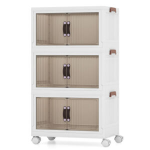 -Translucent doors with convenient handles make it easy to access stored items