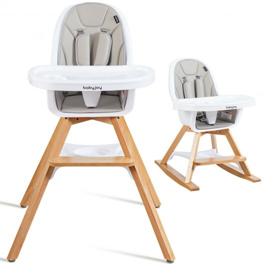 Specifications: Color: Gray/Beige Material: Beech PP PU High chair dimension: 27.5″ x 27.5″ x 41.5″ (L x W x H) Low chair dimension: 21″ x 19″ x 30.5″ (L x W x H) Rocking chair dimension: 26″ x 19″ x 31.5″ (L x W x H) Tray width: 21.5″ Footrest length: 15″ Seat width: 12″ Net weight: 19 LBS Weight capacity: 33 LBS Applicable age: 6 Months-6 years old Package includes: 1 x Baby high chair 1 x Instruction
