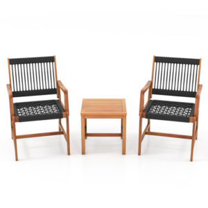 Specifications: Color: Black and Natural Material: Acacia Wood Plastic Rope Dimension of Each Chair: 29.5″ x 24″ x 32″ (L x W x H) Seat Height from the Ground: 16″ Dimension of Coffee Table: 18″ x 18″ x 18″ (L x W x H) Net Weight of Each Chair: 15 lbs Net Weight of Coffee Table: 11 lbs Total Net Weight: 41 lbs Weight Capacity of Each Chair: 360 lbs Weight Capacity of Coffee Table: 165 lbs Package Includes: 1 x Coffee Table 2 x Chairs 1 x Instruction