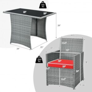 Specifications: Color of rattan: Mixed gray Color of cushion: Gray/Navy/Red/Turquoise/White Material: Steel PE rattan sponge tempered glass polyester fabric Dimension of table:41″ x 25″ x 28″ (L x W x H) Dimension of each chair: 26″ x 22″ x 34″ (L x W x H) Dimension of cushion: 20″ x 20″ x 2.4″ (L x W x Thickness) Seat height from the ground: 16.5″ Net weight of table: 26.5 lbs Net weight of each chair: 15 lbs Weight capacity of table: 110 lbs Weight capacity of each chair: 350 lbs Package includes: 1 x Table 2 x Chairs 2 x Cushions 1 x Instruction