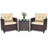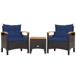 Specifications: Color of PE Rattan: Mix Brown Color of Cushion: Off White/Navy Material: PE Rattan Steel Acacia Wood Sponge Polyester Fabric Dimension of Each Single Sofa: 25″ x 24″ x 29″ (L x W x H) Dimension of Coffee Table: 17.5″ x 17.5″ x 17″ (L x W x H) Dimension of Seat Cushion: 21″ x 20″ x 2.7″ (L x W x T) Dimension of Back Cushion: 21.5″ x 16.5″ x 5″ (L x W x T) Seat Height: 13.5″ Net Weight of Each Sofa: 19 lbs Net Weight of Coffee Table: 10 lbs Weight Capacity of Each Sofa: 350 lbs Weight Capacity of Coffee Table: 90 lbs Package Includes: 2 x Sofa 2 x Back Cushion 2 x Seat Cushion 1 x Coffee Table 1 x Instruction
