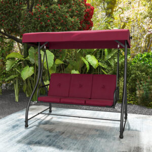 3 Seat Outdoor Porch Swing with Adjustable Canopy-Wine – Color: Wine