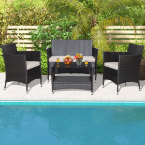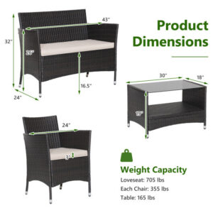 4 Pieces Patio Conversation Set with Soft Cushions and Tempered Glass Tabletop – Color: Brown