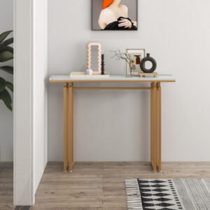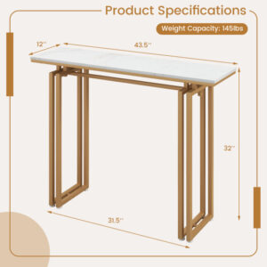 Specifications: Color White + Gold Material MDF Metal Overall Dimension 43.5″ x 12″ x 32″ Width between Support Feet (included) 31.5″ Weight Capacity of Tabletop 165 lbs Net Weight 19 lbs