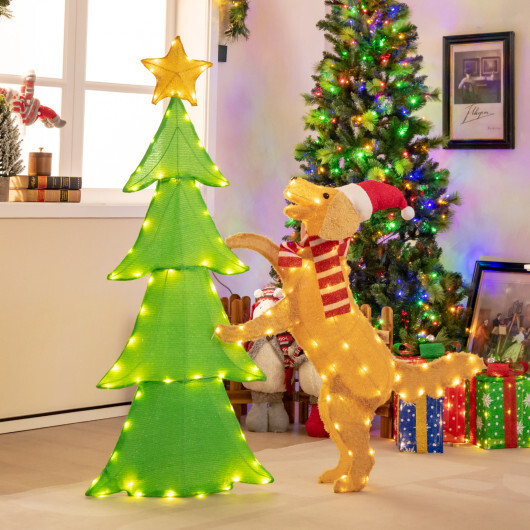 Specifications: Color Multi-color Material Tinsel Fabric Fleece Fabric Metal Overall Dimensions 4.5 ft x 0.7 ft x 4.5 ft Width of Christmas Tree 2 ft Height of Dog 3.2 ft Net Weight 6 lbs