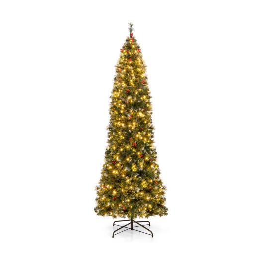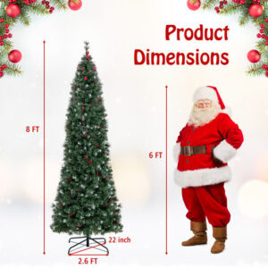 Specifications: Color Green+White Material PVC Pine Needle Metal Tree Height 5/6/7/8/9 ft Tree Width 1.6/1.9/2.3/2.6/2.9 ft Diameter of the Metal Stand 14″/16″/20″/22″/28″ Number of Branch Tips 408/618/818/1168/1298 Number of LED Lights 200/250/350/420/500 Clusters of Red Berries 28/37/46/55/62 Number of Sections 2/3/3/3/4 Net Weight 9/12.5/17/22/26 lbs