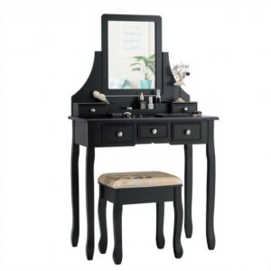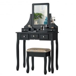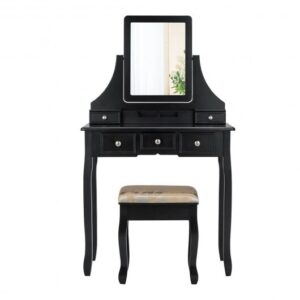 Specifications: Color: White/black Materials: MDF wood (table legs & stool legs) Dimension of table: 31.5″ x 16″ x 55″ (L x W x H) Dimension of stool: 16″ x 12″ x 18″ (L x W x H) Inner dimension of small drawer (on the top section): 5.5″ x 3.5″ x 2″ (W x D x H) Inner dimension of middle drawer: 5″ x 11″ x 2″ (W x D x H) Inner dimension of side drawers: 5″ x 11″ x 3″ (W x D x H) Product net weight: 37.5 lbs Weight capacity of dresser: 286 lbs Weight capacity of stool: 242 lbs Package include: 1 x Dressing table 1 x Dressing stool 1 x Instructions