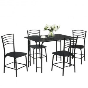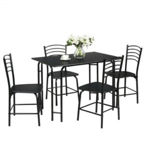 Specifications: Color: Black Material: Iron MDF PVC Table dimension: 42″ x 27.5″ x 29.5″ (L x W x H) Chair dimension: 16″ x 18.5″ x 33.5″ (L x W x H) Net weight: 66 lbs Table weight capacity: 110 lbs Chair weight capacity: 220 lbs Package includes: 1 x Dinging table 4 x Chairs 1 x Instruction manual