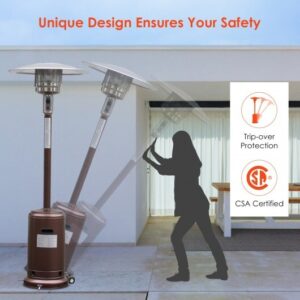 Specifications: Color: Black/Bronze/Gray/Silver Material: Stainless steel Powerful heat: 48 000 BTU Heating range: 175 sq/feet (15 feet radius) Overall height: 87inch Diameter of dome reflector: 32 inch Support pole size: 2.9-inchdiameter 34.3-inchheight Fuel type: Propane or butane Propane gas tank:20 lbs liquid (not included) Burning consumption: About 1-2 lbs per hour Size of burner unit: 11-inchdiameter 21-inchheight Size of base: 19-inchdiameter 3.39-inchheight Net weight: 40 lbs