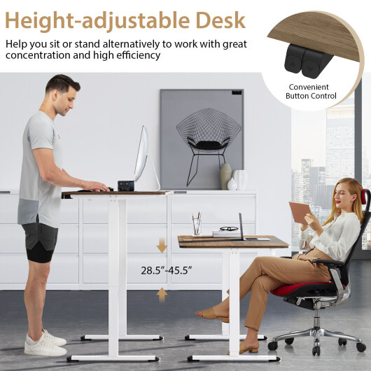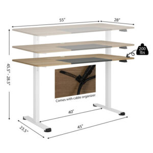Specifications: Color Beige & White/Rustic Brown & Black/Gray & White/Natural & White Material Engineered Wood Metal Overall Dimensions 55″ x 28″ x 28.5″-45.5″ (L x W x H) Outer Spacing of Legs 45″ Inner Spacing of Legs 40″ Length of Feet 23.5″ Max. Speed 0.8″/s Operating Noise < 52 dB Max. Load Capacity 200 lbs Net Weight 50.5 lbs