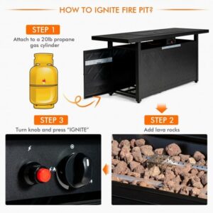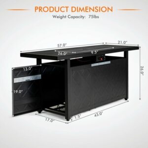 Specifications: Color: Black/Brown Material: Steel stainless steel Overall dimension: 57″ x 21″ x 26″ (L x W x H) Net weight: 68 lbs Output: 50000 BTU Package includes: 1 x Outdoor fire fable 1 x Instruction