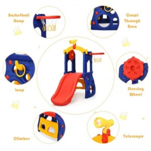 Specifications: Color: As picture shows Material: HDPE Overall dimension: 54″ x 29″ x 53.5″ (L x W x H) Slide dimension: 36″ x15.5″ (L x W) Basketball hoop dimension: 11.5″x40″ (D x H) Steering wheel diameter: 12″ Waiting area dimension: 18.5″x15″ (L x W) Telescope dimension: 7.5″x3.5″ (L x W) Maximum weight capacity: 110 lbs Net weight:26.5 lbs Recommended age: 3-8Years Package includes: 1 x Kids slide set 1 x Instruction