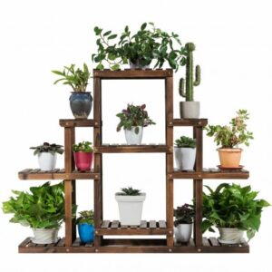 The wood flower rack is made of solid wood which is durable and eco-friendly. The carbonized surface not only makes the shelf harder but also makes the surface more uniform. This treatment also absorbs impurities from the air making it an excellent partner for plants. Not only that insects don’t like it and it has a unique smell. The structure of the 6 layers allows you to place 9 flower pots of different sizes. The hollow design not only increases the breathability of plants but also allows excess water to flow down thus saving water. Its irregular patterns and symmetrical patterns give it a unique shape and you can put it in your living room for all kinds of items. Spray paint on surfaces can be waterproof so you can put it outside.