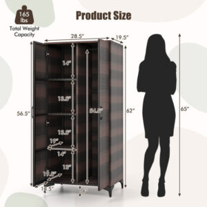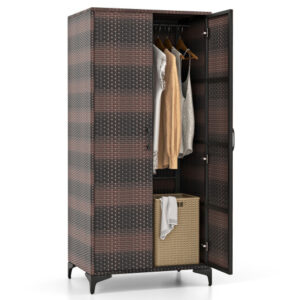 Specifications: Color Black/Mix Brown Material PE Rattan Metal Galvanized Pipe Product Size 28.5″ x 19.5″ x 62″ Dimensions of Single Cabinet Door 56.5″x 13.5″ Dimensions of Upper Storage Cube 14″x19″ x 14″ Dimensions of Bottom Storage Cube 14″x19.5″ x 13″ Height Between Each Storage Cube 14″ 13.5″ 13.5″ 13″ Length of Hanging Rod 12.5″ Height from Hanging Rod to Bottom 54.5″ Height Between Ground and Cabinet 4″ Net Weight 55 lbs Weight Capacity of Hanging Rod 33 lbs Weight Capacity of Each Cube 33 lbs Total Weight Capacity 165 lbs