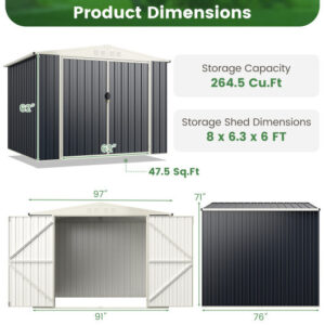 Specifications: Color: Grey Material: Galvanized Color Steel Overall Dimensions: 90″ x 76″ x 71″ (L x W x H) Size of the Door: 62″ x 62″ (L x H) Storage Capacity: 264.5 Cu.Ft Footprint: 47.5 Sq.Ft Net Weight: 149 lbs