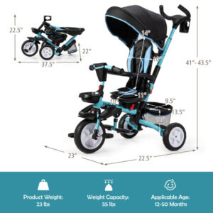 Specifications: Color: Blue/Pink/Gray/Black Material: Steel plastic Product dimension: 23″ x 22.5″ x 41″-43.5″ (L x W x H) Folding dimension: 22″ x 37.5″ x 22.5″ (L x W x H) Product weight: 23 lbs Weight capacity: 55 lbs Applicable age: 12 – 50 months Package includes: 1 x Baby tricycle 1 x Instruction