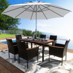 This stylish and functional set includes 6 stackable chairs with armrests as well as a spacious wooden tabletop dining table. The durable rattan construction is weather-resistant and perfect for outdoor use while the 1.96” umbrella hole in the table allows you to add shade on sunny days.