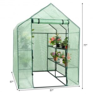 Specifications: Color: Green Cover Material: 140G PE mesh reinforced Dimensions: 57″ x 57″ x 77″(L x W x H) Weight: 23.37 lbs Shelves: 8 wired shelves – 4 on each side Tube: 16mm(dia.) Thickness: 0.4mm Frame: Steel with Green powder coating
