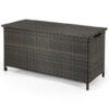 Specifications: Color: Brown/Black Material: PE Rattan PP Metal Polyester Fabric Closed Dimensions: 54″ x 22″ x 25″ (L x W x H) Height of Open Status: 43″ Inner Size: 48.5″ x 19″ x 21″ (L x W x H) Height off the Ground: 3″ Storage Capacity: 85 Gal Load Capacity of Cabinet Top: 66 lbs Load Capacity of Cabinet Bottom: 88 lbs Net Weight: 37.5 lbs