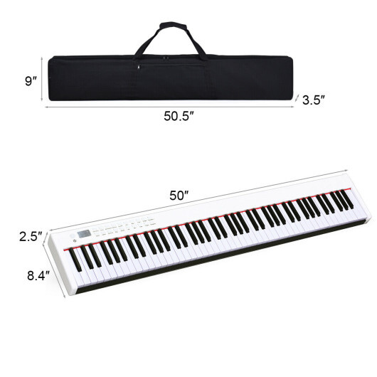Specifications: Color: Black/White Keyboard material: ABS aluminum alloy Case material: Oxford cloth Keyboard dimension: 50″ x 8.4″ x 2.5″ (L x W x H) Case dimension: 50.5″ x 3.5″ x 9″ (L x W x H) Output power of piano: 500 MV Input power of charger: 110 V Charging time: 4 h Playing time: 12 h Net weight: 15 lbs Suitable age: 3+ Package includes: 1 x 88-key digital piano 1 x Case 1 x Charger 1 x Sustain pedal