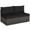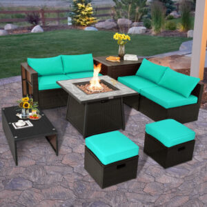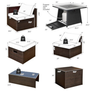 Specifications: Color of Cushions: Black/Gray/Navy/Red/Turquoise/Off White Material: PE Rattan Steel Tempered Glass Polyester Sponge Ceramic Heat Output: 50 000 BTU Overall Dimension of Fire Pit Table: 35″ x 35″ x 24.5″ (L x W x H) Overall Dimension of Coffee Table: 39.5″ x 20″ x 13.5″ (L x W x H) Overall Dimension of Storage Box: 33.5″ x 29.5″ x 26″ (L x W x H) Overall Dimension of Each Ottoman: 17.5″ x 17.5″ x 16″ (L x W x H) Overall Dimension of Each Corner Sofa: 29.5″ x 29.5″ x 25.5″ (L x W x H) Overall Dimension of Each Armless Sofa: 28″ x 27″ x 25″ (L x W x H) Dimension of Each Ottoman’s Cushion: 17.5″ x 17.5″ x 4″ (L x W x Thickness) Dimension of Each Corner Sofa’s Back Cushion: 26″ x 14″ x 7″ (L x W x Thickness) Dimension of Each Corner Sofa’s Seat Cushion: 25″ x 25″ x 4″ (L x W x Thickness) Dimension of Each Armless Sofa’s Back Cushion: 27.5″ x 14″ x 7″ (L x W x Thickness) Dimension of Each Armless Sofa’s Seat Cushion: 27″ x 25″ x 4″ (L x W x Thickness) Overall Dimension of Full Storage: 93″ x 29.5″ x 26″ (L x W x H) Seat Height from the Ground for Each Corner Sofa: 12.5″ Seat Height from the Ground for Each Armless Sofa: 13.5″ Net Weight of Fire Pit Table: 77 lbs Net Weight of Coffee Table: 23 lbs Net Weight of Storage Box: 22 lbs Net Weight of Each Ottoman: 10 lbs Net Weight of Each Corner Sofa: 20 lbs Net Weight of Each Armless Sofa: 18 lbs Weight Capacity of Fire Pit Table: 330 lbs Weight Capacity of Coffee Table: 165 lbs Weight Capacity of Each Ottoman: 350 lbs Weight Capacity of Each Corner Sofa: 350 lbs Weight Capacity of Each Armless Sofa: 350 lbs Package Includes: 1 x Fire Pit Table 1 x Bag of Lava Rock 1 x AAA Battery 1 x Fire Pit PVC Cover 1 x Coffee Table 1 x Storage Box 1 x Sofa Set Waterproof Cover 2 x Ottomans 2 x Corner Sofas 2 x Armless Sofas 2 x Ottoman’s Cushions 4 x Back Cushions 4 x Seat Cushions 2 x Instructions
