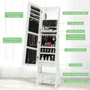 Specifications: Color White Material MDF + Glass Overall Dimension 16″ x 14″ x 62.5″ Cabinet Dimension 47″ x 14.5″ x 4.5″ Battery Requirement 3 AA batteries (not included) Net Weight 38.5 lbs Package includes 1 x Jewelry Armoire 1 x User Guide