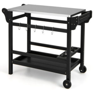 Specifications: Color BlackMaterials Stainless Steel HDPEProduct Dimension 41″ x 21″ x 33.5″Size of Tabletop 34″ x 19″Diameter of Wheel 4″Net Weight 44 lbsWeight Capacity of Tabletop 250 lbsWeight Capacity of Shelf 80 lbs