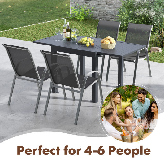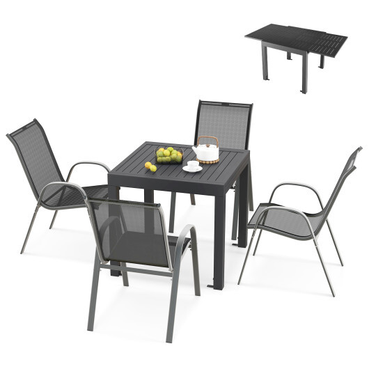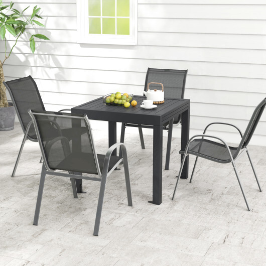 Specifications: Color of Table: Dark Gray Color of Each Chair: Black Gray Material: Aluminum Fabric Metal Dimensions of Square Table: 31.5″ x 31.5″ x 29.5″ / 80 x 80 x 75 cm (L x W x H) Dimensions of Rectangular Table: 63″ x 31.5″ x 29.5″ / 160 x 80 x 75 cm (L x W x H) Dimension of Each Chair: 29″ x 21.5″ x 35.5″ / 73 x 54.5 x 90 cm (L x W x H) Seat Height: 16.5″ / 42 cm Weight Capacity of Each Chair: 330 lbs / 150 kg Weight Capacity of Table: 350 lbs / 160 kg Net Weight of Table: 28 lbs / 13 kg Net Weight of Each Chair: 9 lbs / 4 kg