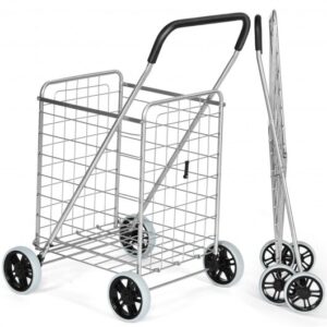 Specifications: Color: Black Material: Steel + plastic Overall dimension (fully extended): 22.5″ x 23″ x 36″ (L x W x H) Folded dimension: 22.5″ x 8.5″ x 42″ (L x W x H) Weight capacity: 100 lbs Net weight: 8.5 lbs Package includes: 1 x Shopping cart 1 x Instruction