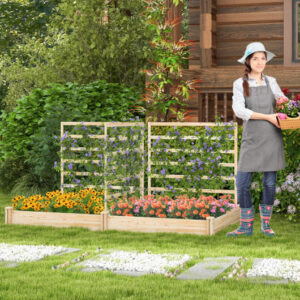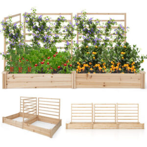 Specifications: Color: Natural Material: Fir Wood Overall Dimensions: 88″ x 45″ x 43″ (L x W x H) Interior Size of Each Planting Box: 42″ x 42″ x 9″ (L x W x H) Size of the Planting Trellis: 39″ x 40″ (L x W) Volume: 18.5 cu.ft Weight Capacity of Each Trellis: 22 lbs Net Weight: 32 lbs