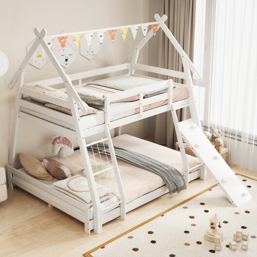 Specifications: Color Natural/White Material Pine Wood MDF Plywood Overall Dimensions 82″ x 67″ x 82.5″(L x W x H) Dimensions of Upper Bunk 75″ x 39.5″(L x W) Upper Bunk to Roof 35″ Width of Ladder Entrance 15″ Guardrail Height 11.5″ Dimensions of Lower Bunk 80.5″ x 61″(L x W) Dimensions of Climbing Ramp 50″ x 13″(L x W) Recommended Mattress for Upper Bunk 6″Max Twin Size Mattress (Not Included) Recommended Mattress for Lower Bunk 8″Max Twin Size Mattress (Not Included) Weight Capacity of Upper Bunk 440 lbs Weight Capacity of Lower Bunk 440 lbs Weight Capacity of Climbing Net 110 lbs Weight Capacity of Climbing Rope 154 lbs Net Weight 129 lbs