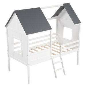 Twin Size Kids House Bed Low Loft Bed Frame with Roof-White – Color: White
